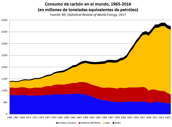 El gráfico adjunto, pone en perspectiva la supuesta retirada del carbón. Entre 1965 y 2013 el consumo mundial de carbón se multiplicó casi tres veces. Desde entonces, ha caído levemente, principalmente por el shale gas en los Estados Unidos y las grandes inversiones chinas en ERNC. En Europa y Eurasia, la caída del consumo ya ocurrió hace más de dos décadas, entre 1989 y 1999, en respuesta a la lluvia ácida. En el resto del mundo (que incluye a África y Latinoamérica) el uso de carbón crece, pero se trata en su mayoría de economías pequeñas o subdesarrolladas que pesan poco y que consumen poco carbón y energía. El desarrollo de China e India explica en gran medida el crecimiento del consumo mundial de carbón.