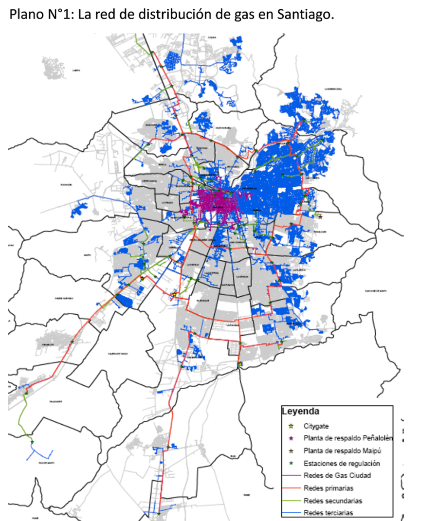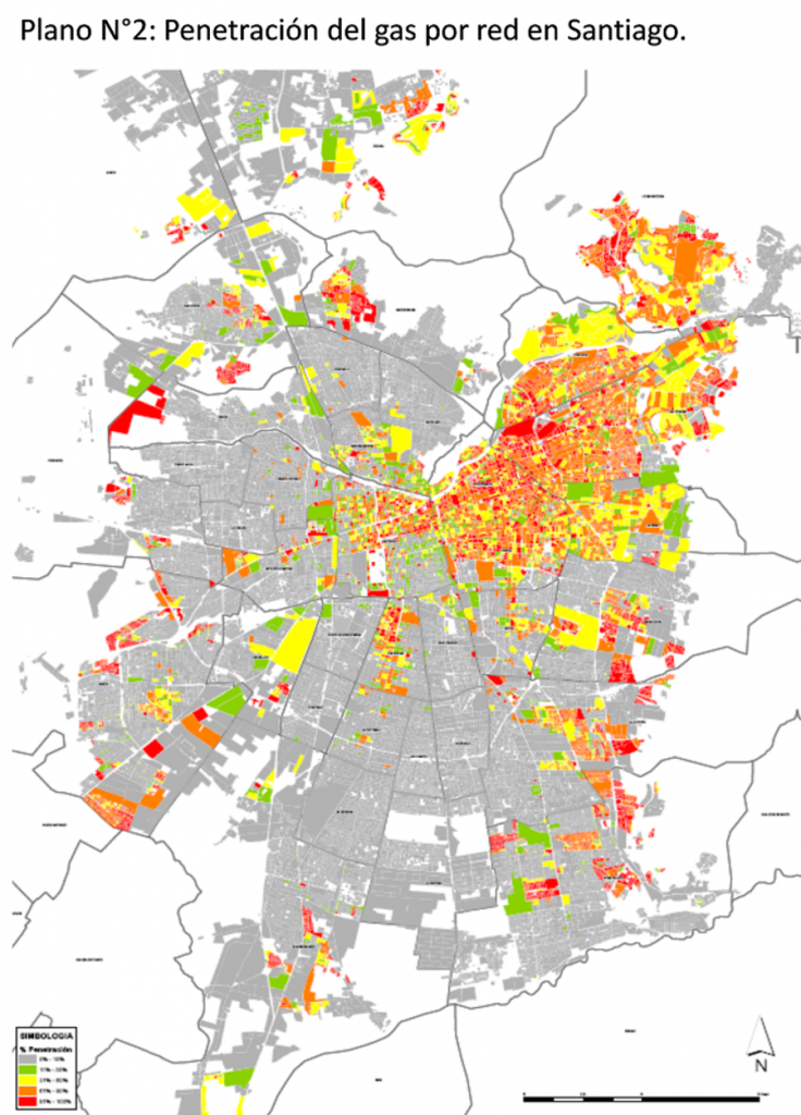 El Plano 1 muestra, en azul, por dónde pasa la red terciaria de distribución de gas. El Plano 2 muestra, manzana por manzana, la penetración del gas por red en Santiago. En rojo se muestran aquellas manzanas tales que más del 90% de las direcciones está conectada al gas por red; en las manzanas coloreadas con naranja la proporción varía entre 60,1% y 90%; en aquellas coloreadas en amarillo, varía entre 30,1% y 60%; y en las manzanas coloreadas con verde, varía entre 0,1% y 30%. Finalmente, en gris se muestran aquellas manzanas en que no hay direcciones conectadas al gas por red.