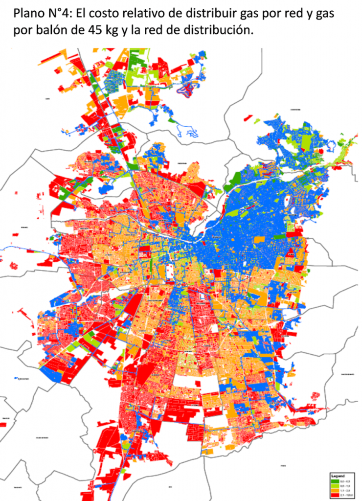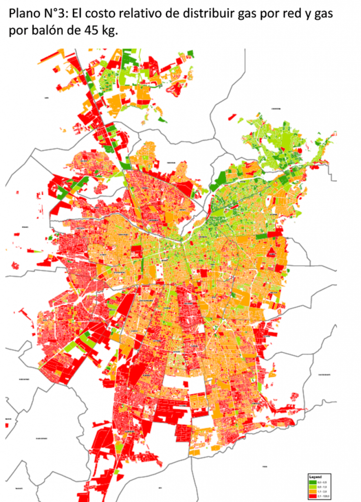 ¿Qué tan grande es esta variación de costos incrementales? El Plano 3 muestra el costo de distribuir Btus por red relativo al costo de distribuirlas en balones de 45 kg10,11. En verde oscuro se pintan las manzanas tales que el costo por millón de Btu de distribuir por una red es no más que la mitad del costo de distribución por balón de 45 kg. En verde claro se pintan las manzanas tales que la razón varía entre 0,5 y 1. En naranjo, aparecen las manzanas tales que el costo de distribuir gas por red es entre una y dos veces el costo de distribuirlas por balón de 45 kg. Por último, en rojo aparecen las manzanas tales que la razón es dos veces o más. Si la distribución de gas por red fuese monopolio natural, todo el plano sería de color verde oscuro. Por el contrario, en el plano predomina el naranjo y hay más hectáreas cubiertas de rojo que de verde.