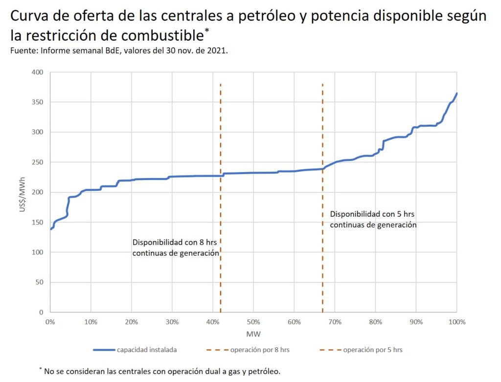 Actualmente, la capacidad termoeléctrica a petróleo instalada en el sistema interconectado es de poco menos de 4.000 MW2, un poco más de la tercera parte de la demanda máxima de electricidad, es decir, existiría suficiente capacidad instalada en centrales a petróleo como para reemplazar una buena parte de la faltante generación hidroeléctrica. Sin embargo, el estudio del Coordinador advierte que el suministro de petróleo de estas centrales estaría limitado a sólo 3.500 m3/día; volumen muy inferior a lo que el Coordinador estima que se podría requerir en los próximos meses. En términos simples, la limitación operacional sería tan relevante que implicaría que menos del 70% de todo el parque de termoeléctricas a petróleo sería capaz de operar continuamente por 5 horas diarias.