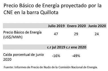 Según se observa en la tabla siguiente, las estimaciones de la CNE muestran una caída en el Precio Básico de Energía de casi un 50%, respecto de las proyecciones que había hecho en julio de 2019, y de 16%, si la base de comparación son las proyecciones de inicio del año ―comparaciones en dólares del año ―. El Precio Básico de Energía es un promedio ponderado calculado en valor presente del costo marginal de la energía del sistema, en una ventana de cuatro años.