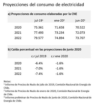 En sus nuevas proyecciones, la CNE estima que el consumo de electricidad caería entre 6 y 9 por ciento, respecto de las estimaciones de 2019. Sobre la misma base, la nueva proyección de precios spot apunta a una caída de casi un 50% en términos reales.