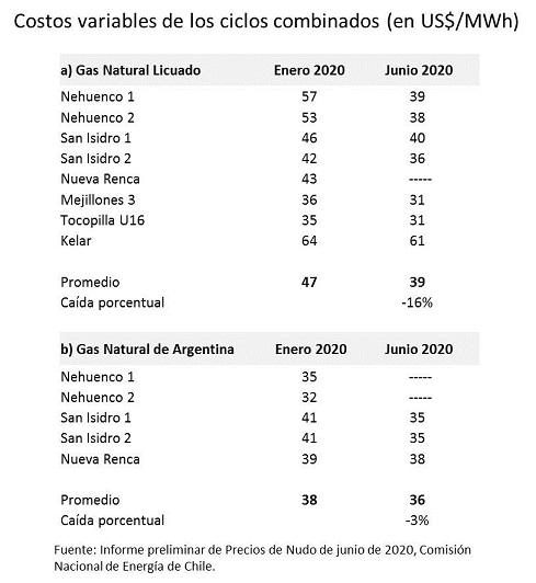Por su parte, en los primeros meses de sus proyecciones, la CNE dio cuenta del menor precio internacional del gas natural. En la siguiente tabla, se exhibe el costo variable de los ciclos combinados a gas natural licuado, el cual cayó un 16% respecto de la fijación de precios de enero, mientras que los mismos ciclos usando gas natural de Argentina, presentaron un costo variable inferior sólo en 3% respecto de la fijación pasada.